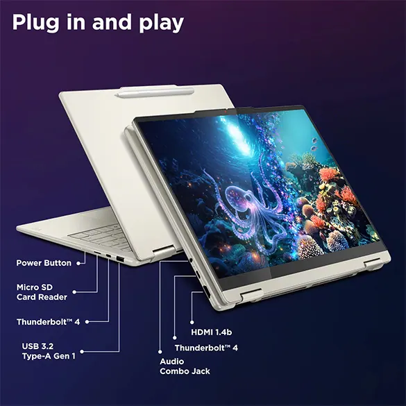 Experience versatility and premium design with the Lenovo Yoga 7i 2-in-1. Powered by Intel Core Ultra 5, it delivers smooth performance for work or play. The 35.56 cm touchscreen flips easily between laptop and tablet modes, wrapped in a stunning Seashell-toned vegan leather finish. Perfect for those who value style, portability, and all-day productivity.